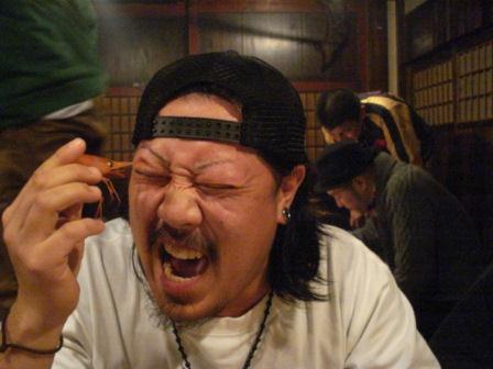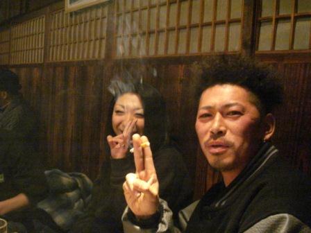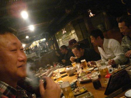 奥から、エイトパワー秘書さん(清水さんの福利厚生費の使い方を厳しくチェック)、デライトオート中村さん(3メートルの雪山に悩む)、中村さんの弟子(眉毛全部剃っちゃった)、次郎さん(400馬力)清水さん(人体の心臓をV8にしたい)、山林さん(路面電車に詳しい)、手前に写るは、山崎自工の山崎さん(ガンナムスタイル)